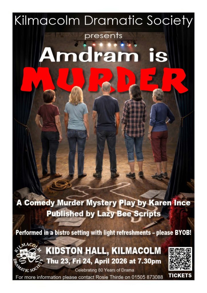 Our next show sees us embarking on something we’ve talked about for sometime, a Murder Mystery play. The title we’ve chosen, AmDram is Murder by Karen Ince, is aptly based around a village amateur drama group performing their own murder mystery….. when a brutal killing takes place! Intrigued? With the Kidston Hall being converted to an intimate bistro setting, light refreshments served and a BYOB option for drinks, what’s not to like? To top it all audience participation is encouraged, with a prize being awarded each evening to one lucky person who correctly identifies the culprit!